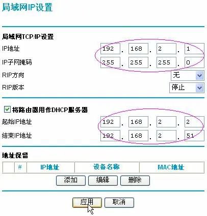 待路由器更新设置完成后,再次使用前面介绍的ipconfig/release和ipconfig/renew两个DOS命令来更新电脑的IP信息,若电脑获得了正确的IP(即192.168.2. ),说明路由器的设置已生效,现在可以将其跟ADSL MODEM连接了。最后再进入路由器的基本设置页面,点击 应用 ,路由器就进行拨号了。